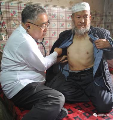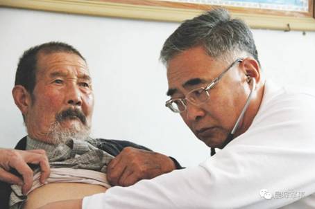 2012年青海行为当地百姓看病:年过八旬的藏族老人第一次接受正规检查治疗。张伯礼用手握暖听诊器,轻轻放到老人身上。(资料图)