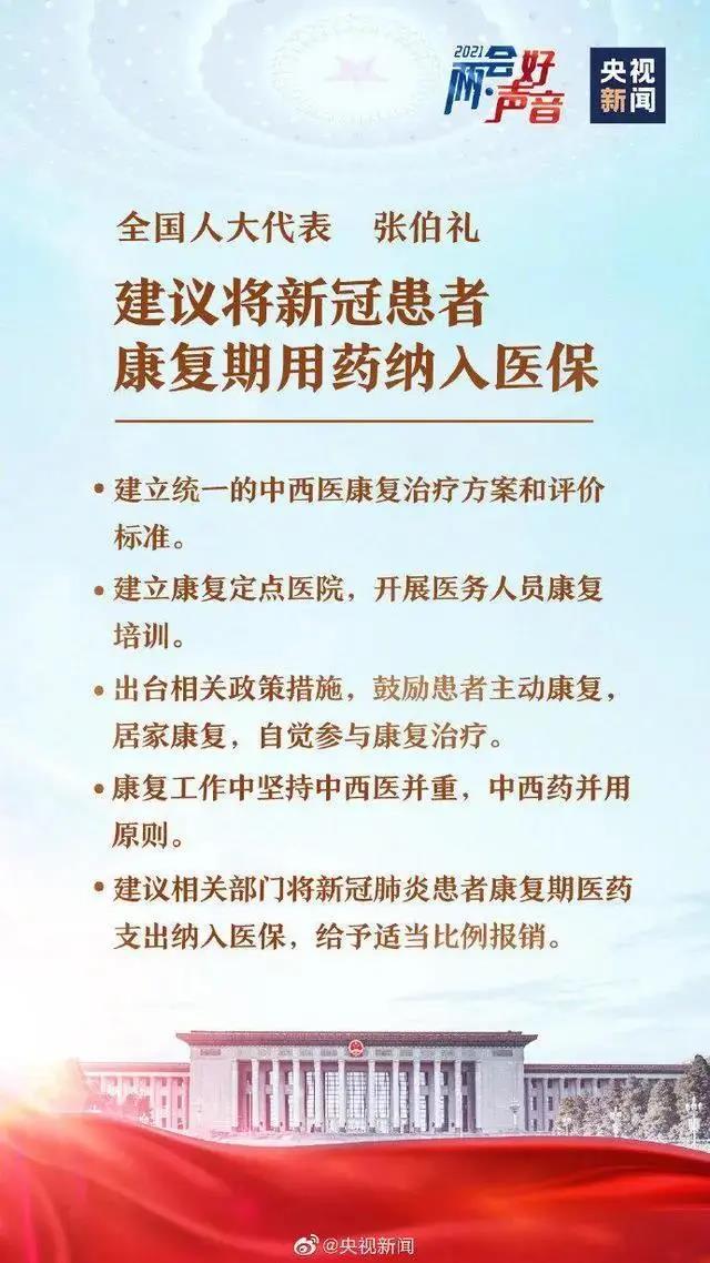 张伯礼表示,这次两会,他带来了新冠肺炎患者愈后康复问题的提案,新冠肺炎患者治愈后应该进行早期的、规范化、综合性康复,建议相关部门将新冠肺炎患者康复期医药支出纳入医保,给予适当比例报销。