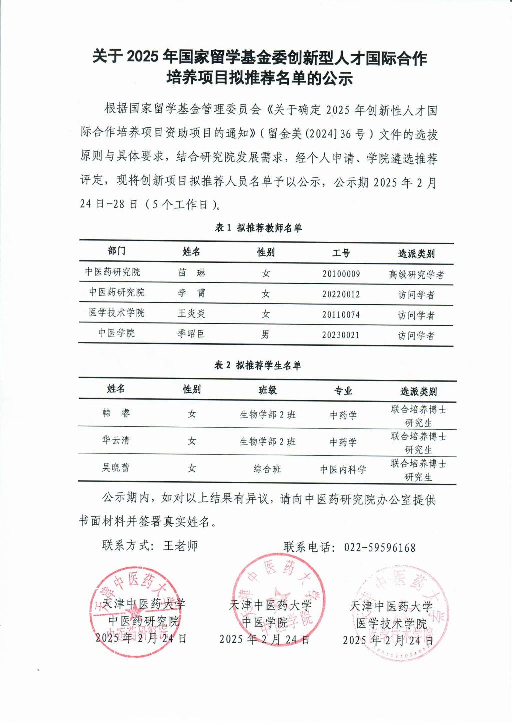 根据国家留学基金管理委员会《关于确定2025年创新性人才国际合作培养项目资助项目的通知》(留金美(2024]36号)文件的选拔原则与具体要求,结合研究院发展需求,经个人申请、学院遴选推荐评定,现将创新项目拟推荐人员情况公示如下: