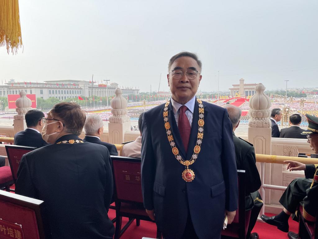 在这重大而庄严的日子,有幸在天安门城楼参加庆祝中国共产党成立100周年大会。当看到空军直升机挂着巨大的党旗,护旗梯队悬挂“伟大的中国共产党万岁!伟大的中华人民共和国万岁!伟大的中国人民万岁!全国各族人民大团结万岁!”等巨幅标语飞越天安门广场,以及战斗机编队摆出“71”等队型从上空飞过,感到无比自豪、令人震撼!