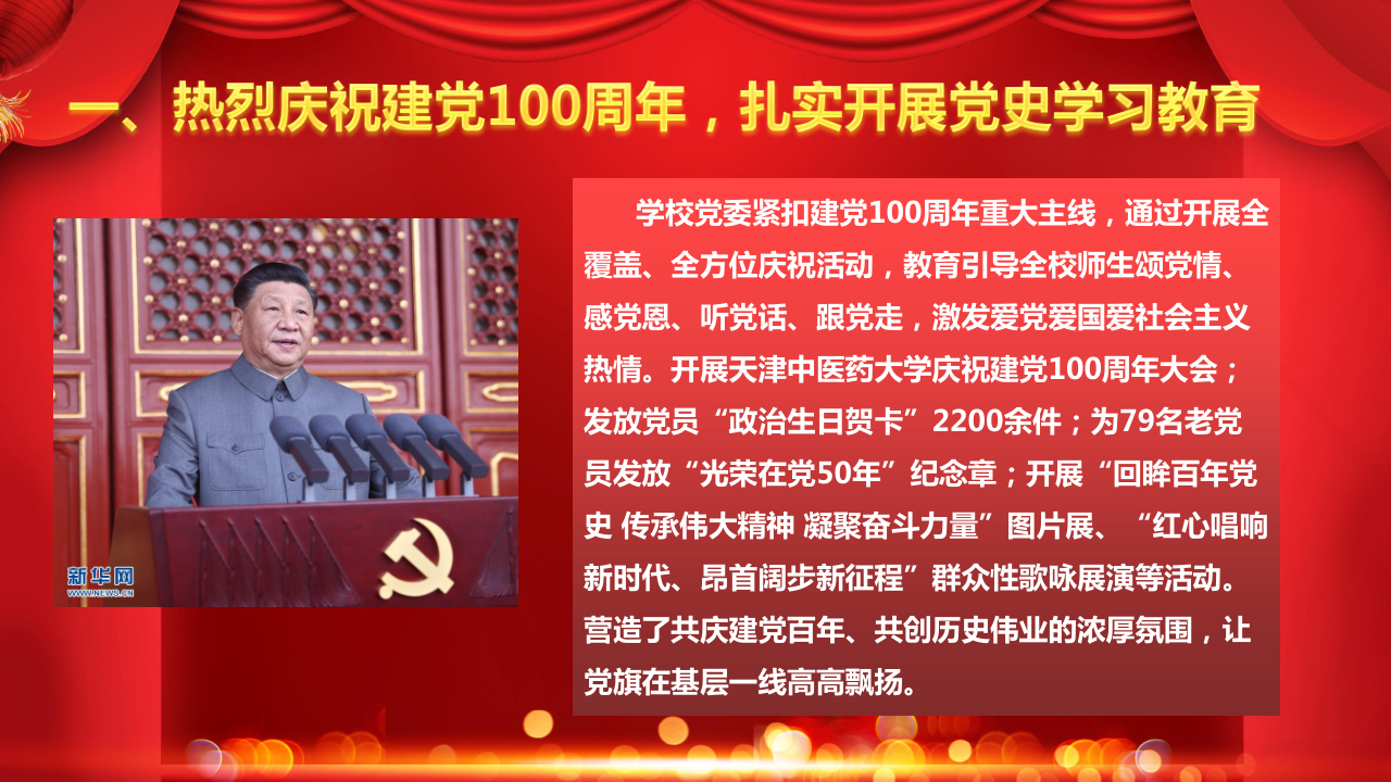 学校党委紧扣建党100周年重大主线,通过开展全覆盖、全方位庆祝活动,教育引导全校师生颂党情、感党恩、听党话、跟党走,激发爱党爱国爱社会主义热情。开展天津中医药大学庆祝建党100周年大会;发放党员“政治生日贺卡”2200余件;为79名老党员发放“光荣在党50年”纪念章;开展“回眸百年党史 传承伟大精神 凝聚奋斗力量”图片展、“红心唱响新时代、昂首阔步新征程”群众性歌咏展演等活动。营造了共庆建党百年、共创历史伟业的浓厚氛围,让党旗在基层一线高高飘扬。
