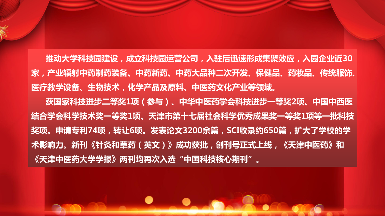 获国家科技进步二等奖1项(参与)、中华中医药学会科技进步一等奖2项、中国中西医结合学会科学技术奖一等奖1项、天津市第十七届社会科学优秀成果奖一等奖1项等一批科技奖项。申请专利74项,转让6项。发表论文3200余篇,SCI收录约650篇,扩大了学校的学术影响力。新刊《针灸和草药(英文)》成功获批,创刊号正式上线,《天津中医药》和《天津中医药大学学报》两刊均再次入选“中国科技核心期刊”。