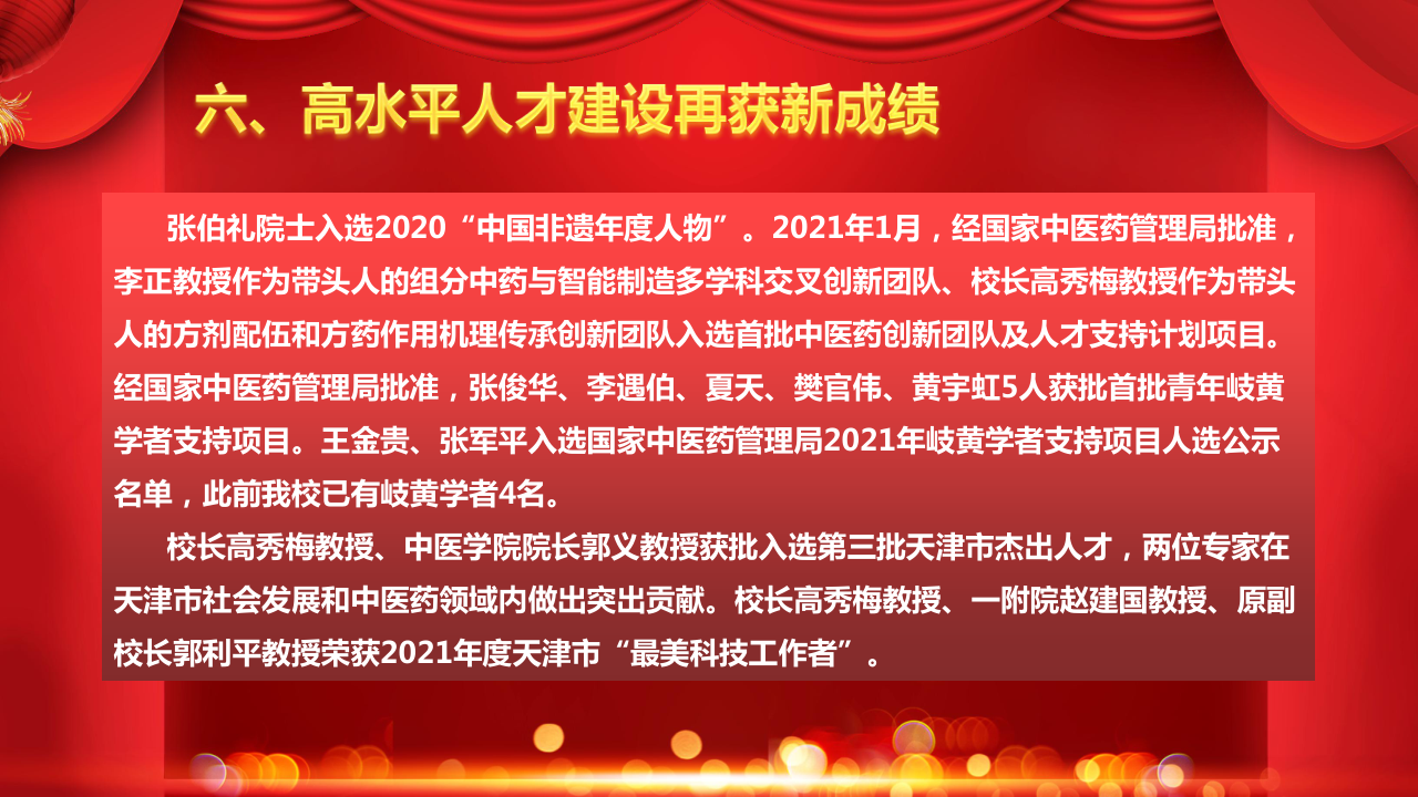 张伯礼院士入选2020“中国非遗年度人物”。2021年1月,经国家中医药管理局批准,李正教授作为带头人的组分中药与智能制造多学科交叉创新团队、校长高秀梅教授作为带头人的方剂配伍和方药作用机理传承创新团队入选首批中医药创新团队及人才支持计划项目。经国家中医药管理局批准,张俊华、李遇伯、夏天、樊官伟、黄宇虹5人获批首批青年岐黄学者支持项目。王金贵、张军平入选国家中医药管理局2021年岐黄学者支持项目人选公示名单,此前我校已有岐黄学者4名。