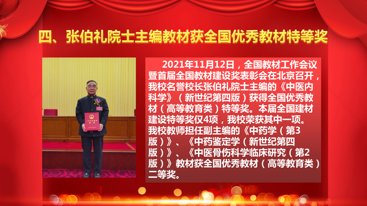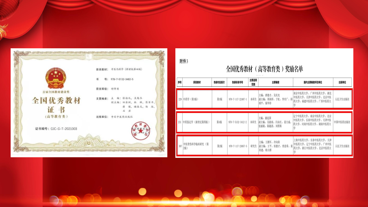 2021年11月12日,全国教材工作会议暨首届全国教材建设奖表彰会在北京召开,我校名誉校长张伯礼院士主编的《中医内科学》(新世纪第四版)获得全国优秀教材(高等教育类)特等奖。本届全国教材建设特等奖仅4项,我校荣获其中一项。我校教师担任副主编的《中药学(第3版)》、《中药鉴定学(新世纪第四版)》、《中医骨伤科学临床研究(第2版)》教材获全国优秀教材(高等教育类)二等奖。