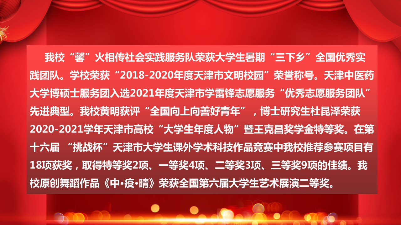 我校“馨”火相传社会实践服务队荣获大学生暑期“三下乡”全国优秀实践团队。学校荣获“2018-2020年度天津市文明校园”荣誉称号。天津中医药大学博硕士服务团入选2021年度天津市学雷锋志愿服务“优秀志愿服务团队”先进典型。我校黄明获评“全国向上向善好青年”,博士研究生杜昆泽荣获2020-2021学年天津市高校“大学生年度人物”暨王克昌奖学金特等奖。在第十六届 “挑战杯”天津市大学生课外学术科技作品竞赛中我校推荐参赛项目有18项获奖,取得特等奖2项、一等奖4项、二等奖3项、三等奖9项的佳绩。我校原创舞蹈作品《中•疫•晴》荣获全国第六届大学生艺术展演二等奖。