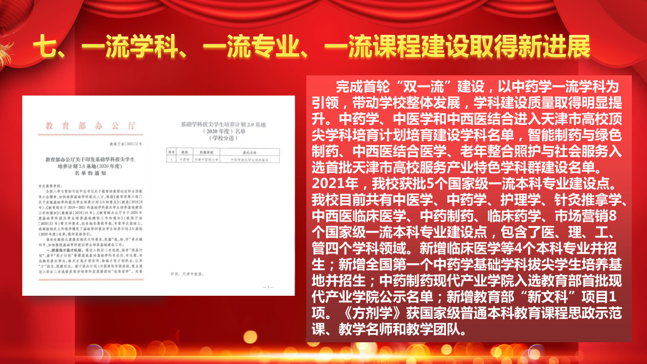 完成首轮“双一流”建设,以中药学一流学科为引领,带动学校整体发展,学科建设质量取得明显提升。中药学、中医学和中西医结合进入天津市高校顶尖学科培育计划培育建设学科名单,智能制药与绿色制药、中西医结合医学、老年整合照护与社会服务入选首批天津市高校服务产业特色学科群建设名单。2021年,我校获批5个国家级一流本科专业建设点。我校目前共有中医学、中药学、护理学、针灸推拿学、中西医临床医学、中药制药、临床药学、市场营销8个国家级一流本科专业建设点,包含了医、理、工、管四个学科领域。新增临床医学等4个本科专业并招生;新增全国第一个中药学基础学科拔尖学生培养基地并招生;中药制药现代产业学院入选教育部首批现代产业学院公示名单;新增教育部“新文科”项目1项。《方剂学》获国家级普通本科教育课程思政示范课、教学名师和教学团队。