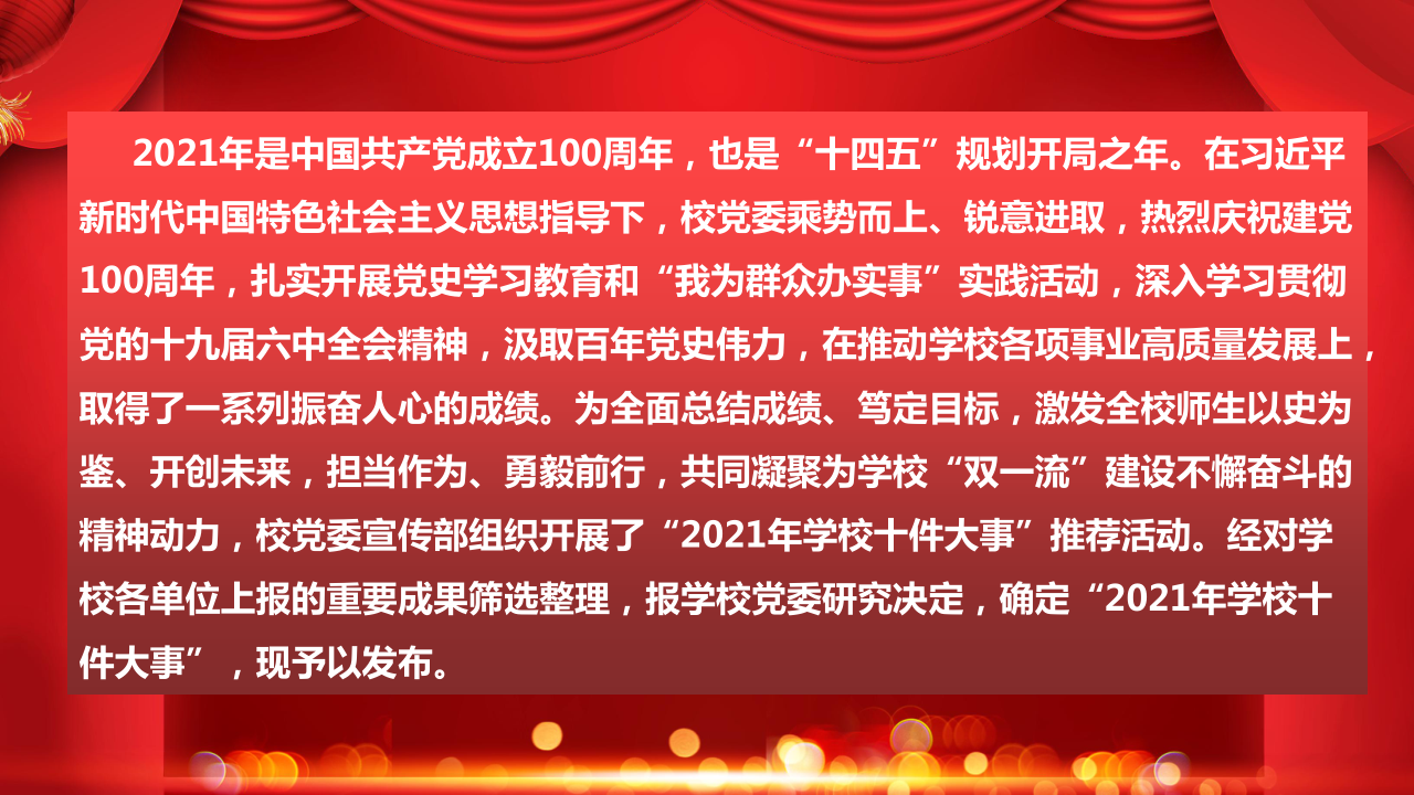 2021年是中国共产党成立100周年,也是“十四五”规划开局之年。在习近平新时代中国特色社会主义思想指导下,校党委乘势而上、锐意进取,热烈庆祝建党100周年,扎实开展党史学习教育和“我为群众办实事”实践活动,深入学习贯彻党的十九届六中全会精神,汲取百年党史伟力,在推动学校各项事业高质量发展上,取得了一系列振奋人心的成绩。为全面总结成绩、笃定目标,激发全校师生以史为鉴、开创未来,担当作为、勇毅前行,共同凝聚为学校“双一流”建设不懈奋斗的精神动力,校党委宣传部开展了“2021年学校十件大事”推荐活动。经对学校各单位上报的重要成果筛选整理,报学校党委研究决定,确定“2021年学校十件大事”,现予以发布。