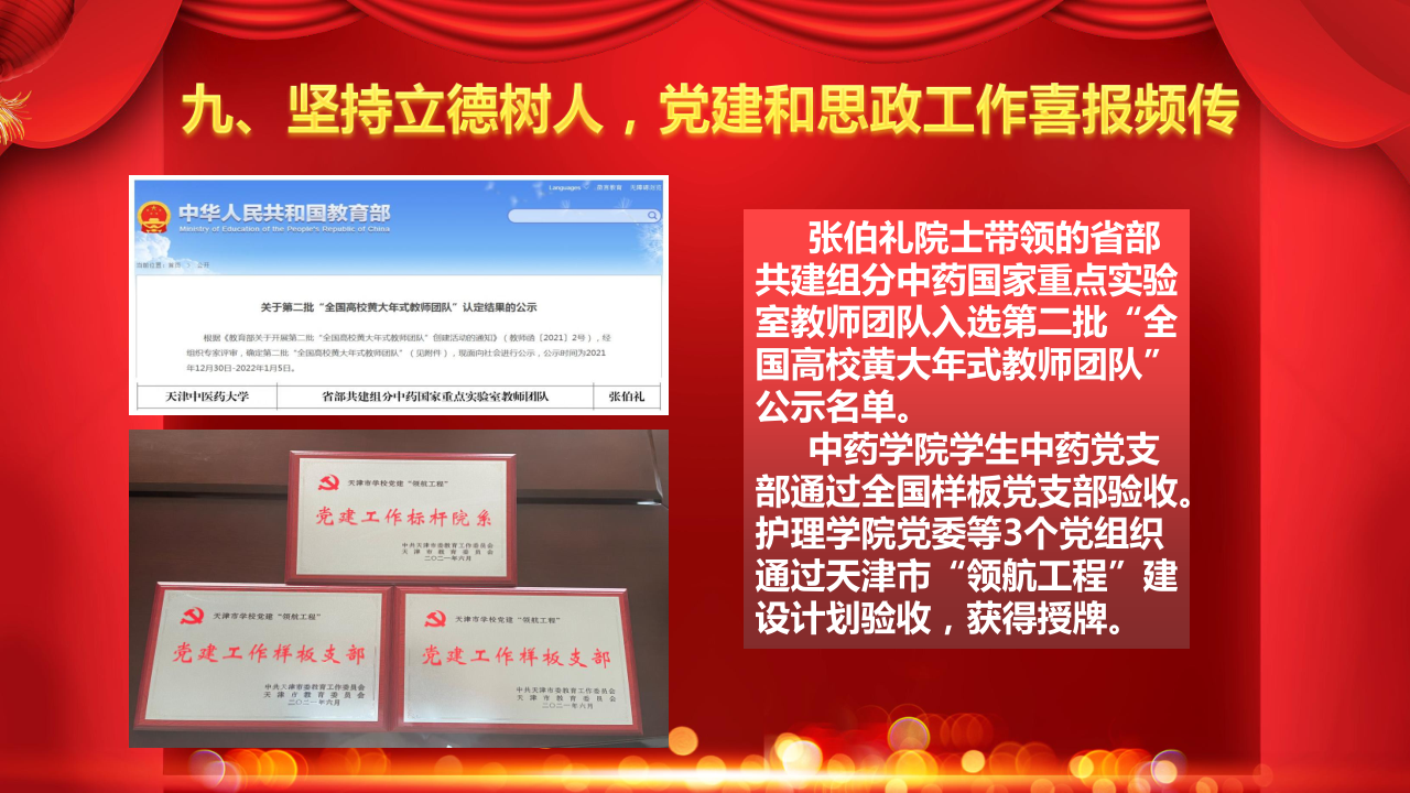 张伯礼院士带领的省部共建组分中药国家重点实验室教师团队入选第二批“全国高校黄大年式教师团队”公示名单。中药学院学生中药党支部通过全国样板党支部验收。护理学院党委等3个党组织通过天津市“领航工程”建设计划验收,获得授牌。1名同志荣获天津市优秀共产党员,1名同志荣获天津市优秀党务工作者。6名同志获得教育系统优秀共产党员,3名同志获得教育系统优秀党务工作者,3个党组织获评教育系统先进基层党组织,3个党组织获得2020—2021年度教育系统“创最佳党日”优秀活动。我校选派87人援疆实习支教团,助力民族地区乡村振兴及基础教育。校党委选派6名驻村干部赴蓟州区白涧镇、邦均镇开展扶持经济薄弱村发展工作。