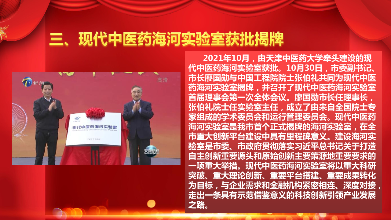 2021年10月,由天津中医药大学牵头建设的现代中医药海河实验室获批。10月30日,市委副书记、市长廖国勋与中国工程院院士张伯礼共同为现代中医药海河实验室揭牌,并召开了现代中医药海河实验室首届理事会第一次全体会议。廖国勋市长任理事长,张伯礼院士任实验室主任,成立了由来自全国院士专家组成的学术委员会和运行管理委员会。现代中医药海河实验室是我市首个正式揭牌的海河实验室,在全市重大创新平台建设中具有里程碑意义。建设海河实验室是市委、市政府贯彻落实习近平总书记关于打造自主创新重要源头和原始创新主要策源地重要要求的一项重大举措。现代中医药海河实验室将以重大科研突破、重大理论创新、重要平台搭建、重要成果转化为目标,与企业需求和金融机构紧密相连、深度对接,走出一条具有示范借鉴意义的科技创新引领产业发展之路。