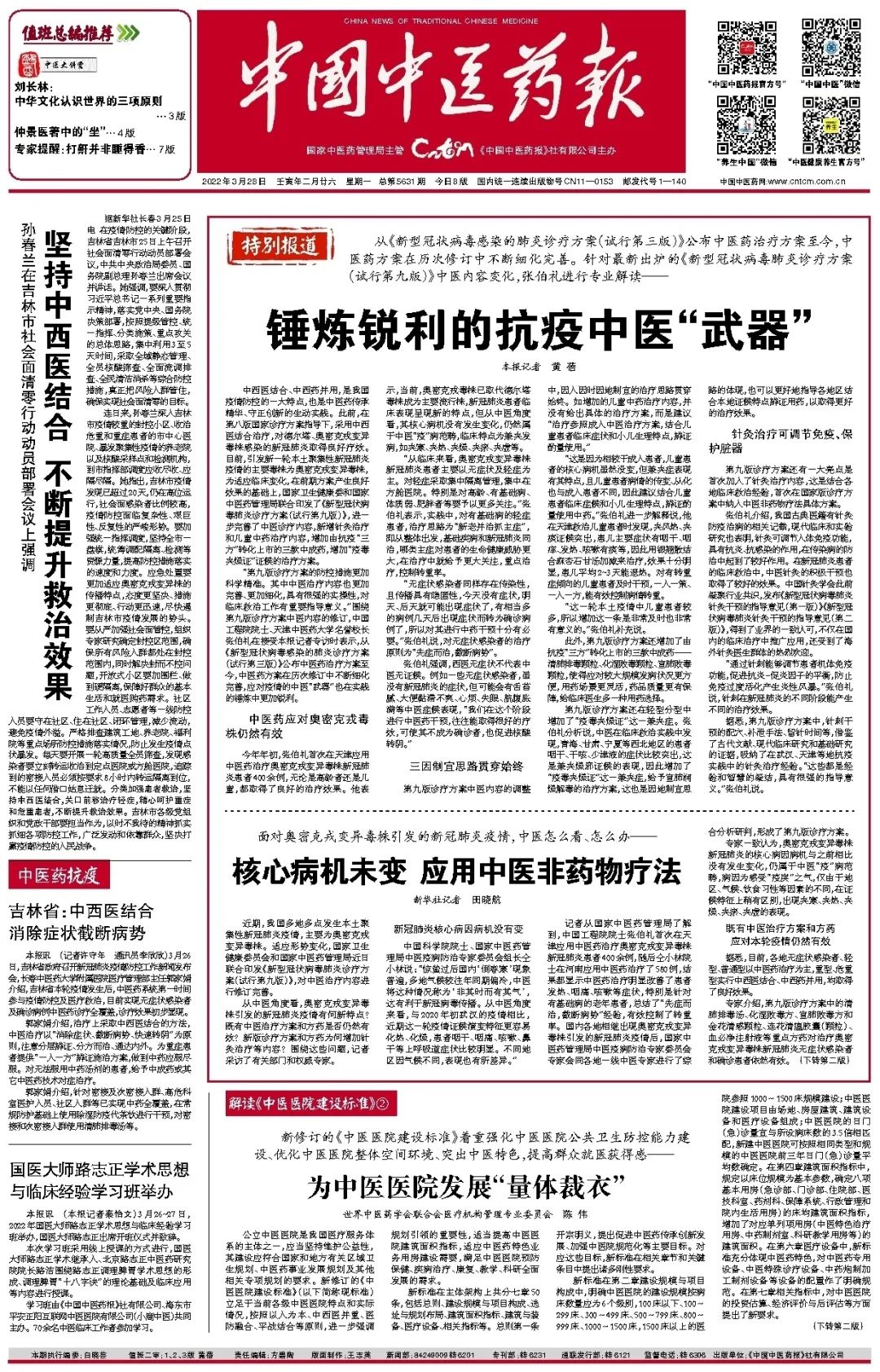 中西医结合、中西药并用,是我国疫情防控的一大特点,也是中医药传承精华、守正创新的生动实践。此前,在第八版国家诊疗方案指导下,采用中西医结合治疗,对德尔塔、奥密克戎变异毒株感染的新冠肺炎取得良好疗效。目前,引发新一轮本土聚集性新冠肺炎疫情的主要毒株为奥密克戎变异毒株,为适应临床变化,在前期方案产生良好效果的基础上,国家卫生健康委和国家中医药管理局联合印发了《新型冠状病毒肺炎诊疗方案(试行第九版)》,进一步完善了中医诊疗内容,新增针灸治疗和儿童中药治疗内容,增加由抗疫“三方”转化上市的三款中成药,增加“疫毒夹燥证”证候的治疗方案。