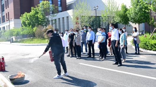 在保卫处同志的指导下,与会领导和教师一同参加了消防灭火现场演练,并在印有“安全月”主题的展板上签名,履行“强化安全责任担当”的承诺。