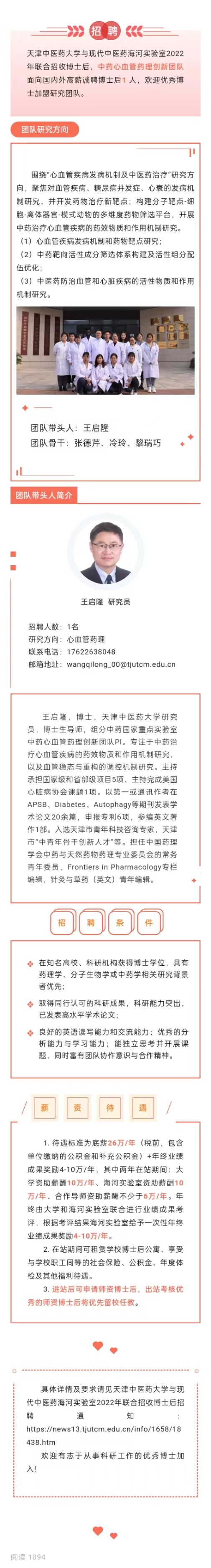 天津中医药大学与现代中医药海河实验室联合招聘博士后——王启隆团队招收博士后