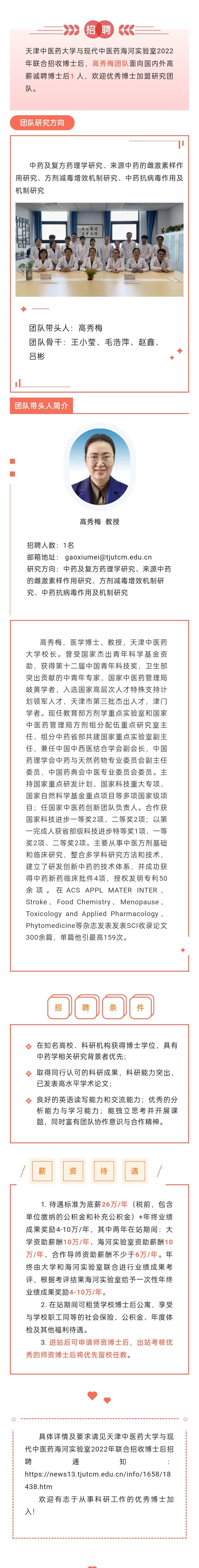 天津中医药大学与现代中医药海河实验室联合招聘博士后——高秀梅团队招收博士后