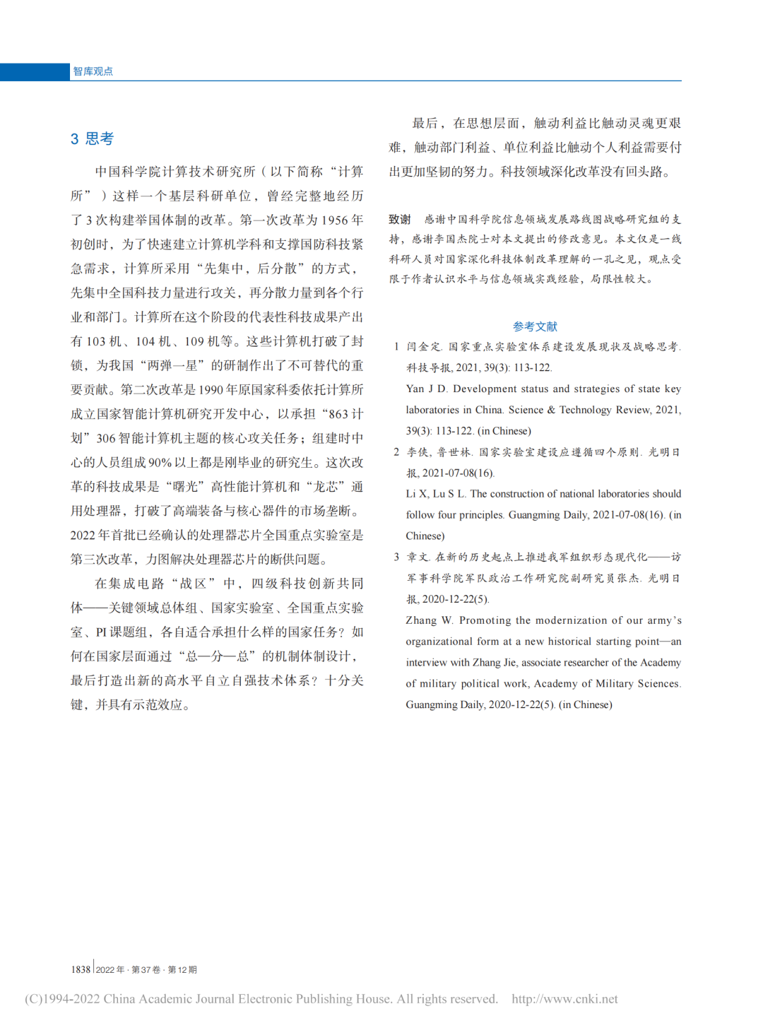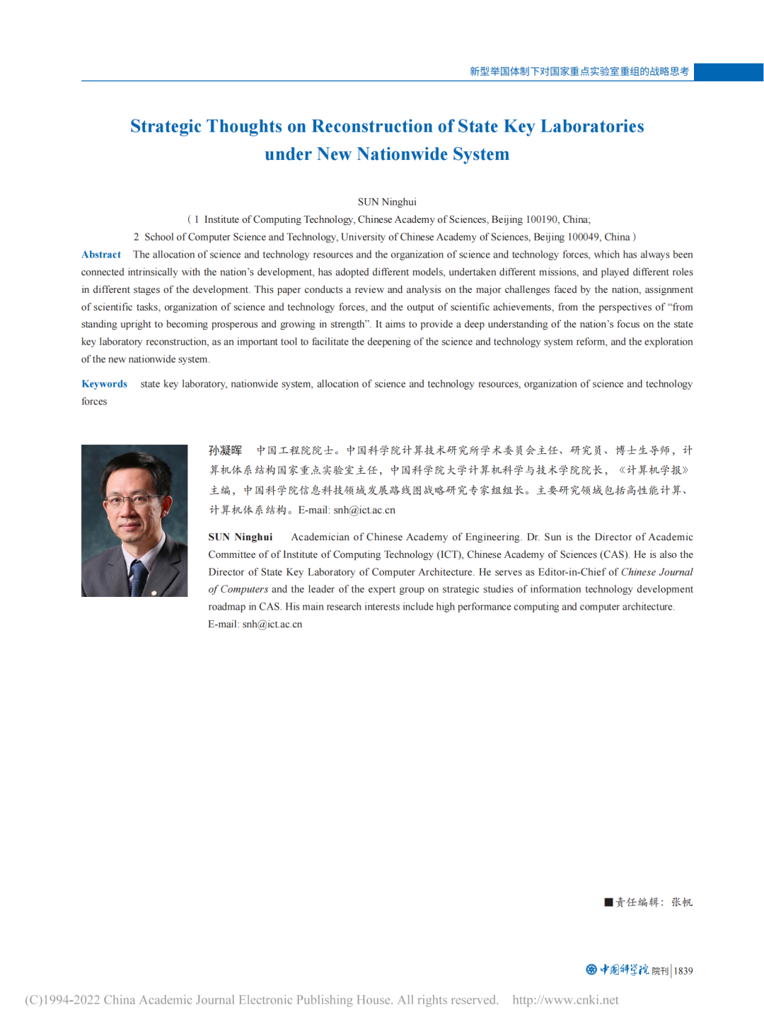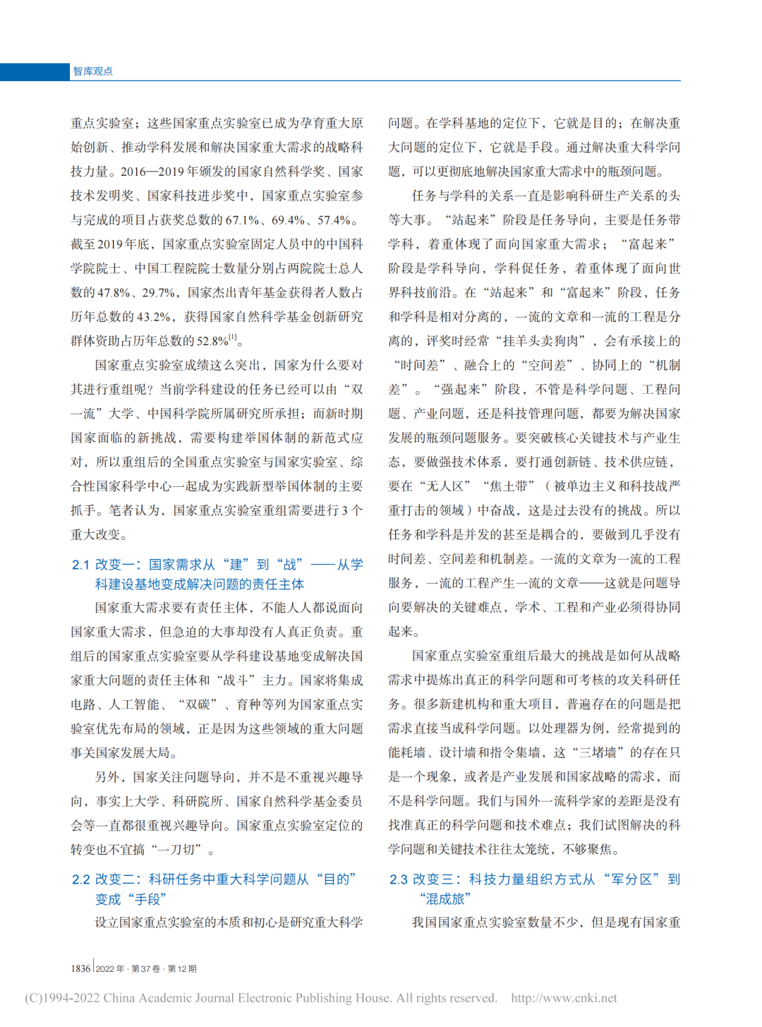 以下为文章原文:孙凝晖. 新型举国体制下对国家重点实验室重组的战略思考. 中国科学院院刊, 2022, 37(12): 1833-1839.DOI:10.16418/j.issn.1000-3045.20220509001