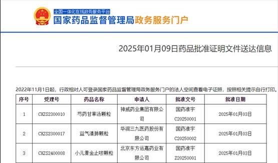 1月9日,国家药品监督管理局发布了药品批准证明文件信息,3个中药新药获批上市。其中益气清肺颗粒是天津中医药大学张伯礼院士团队研发的中药新药,由华润三九医药股份有限公司完成上市申请。