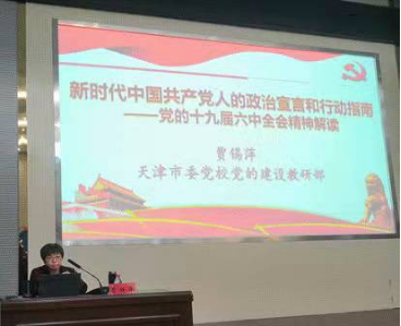 为深入学习贯彻党的十九届六中全会精神,进一步统一思想、凝聚共识、坚定信心、增强斗志,引导学校师生干部把思想和行动统一到党中央重大决策部署上来,我校于12月3日下午在求真报告厅举办深入学习贯彻党的十九届六中全会精神专题培训会。会上邀请中共天津市委党校贾锡萍教授进行专题讲解。学校和附属医院党政领导及处级领导干部参加培训。校党委督查室主任兼组织部副部长朱莹主持。