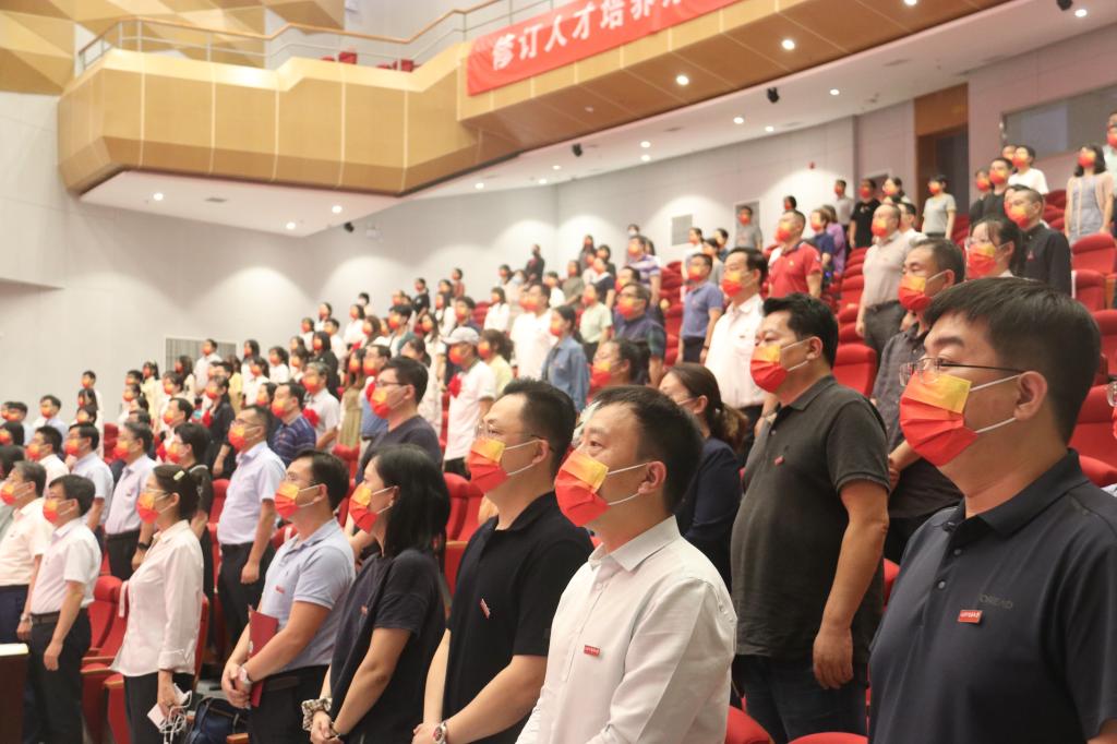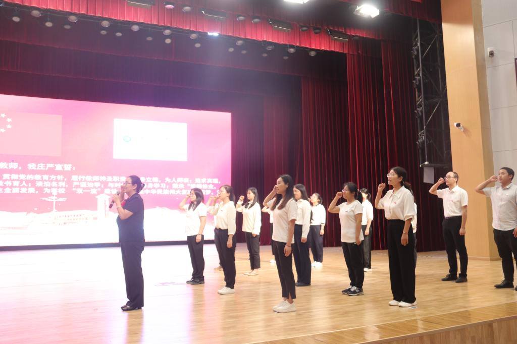 校长高秀梅领誓,全体参会老师与新教师一起,面对国旗与校旗宣誓:“忠诚党的教育事业,贯彻党的教育方针,履行教师神圣职责,修身立德,为人师表;追求真理,崇尚科学;敬业爱生,教书育人;淡泊名利,严谨治学;与时俱进,终身学习;秉承‘进德修业,继承创新’校训,为学生全面发展,为学校‘双一流’建设,为实现中华民族伟大复兴中国梦,贡献自己的智慧和力量。”