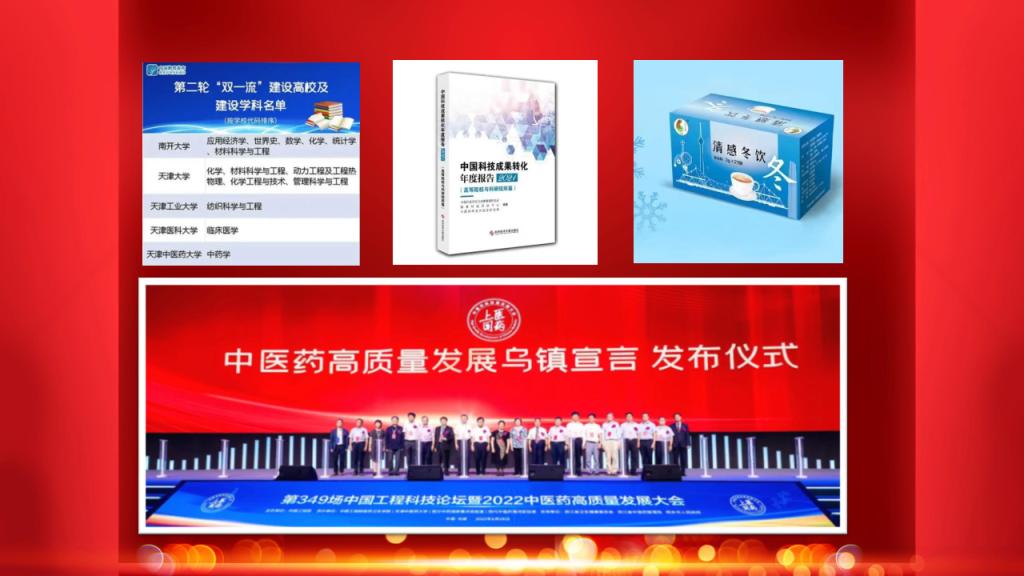 入选中国科技成果转化百强高校,名列第五名。2022年科研成果转化成效突出,治疗新冠肺炎病毒恢复期新药清金益气颗粒成功转让,清感饮(系列)制剂首笔专利许可费到账。天津中医药大学科技园获得天津市大学科技园认定。承办第349场中国工程科技论坛暨2022中医药高质量发展大会、发布《中医药高质量发展乌镇宣言》,进一步增强了学校影响力。