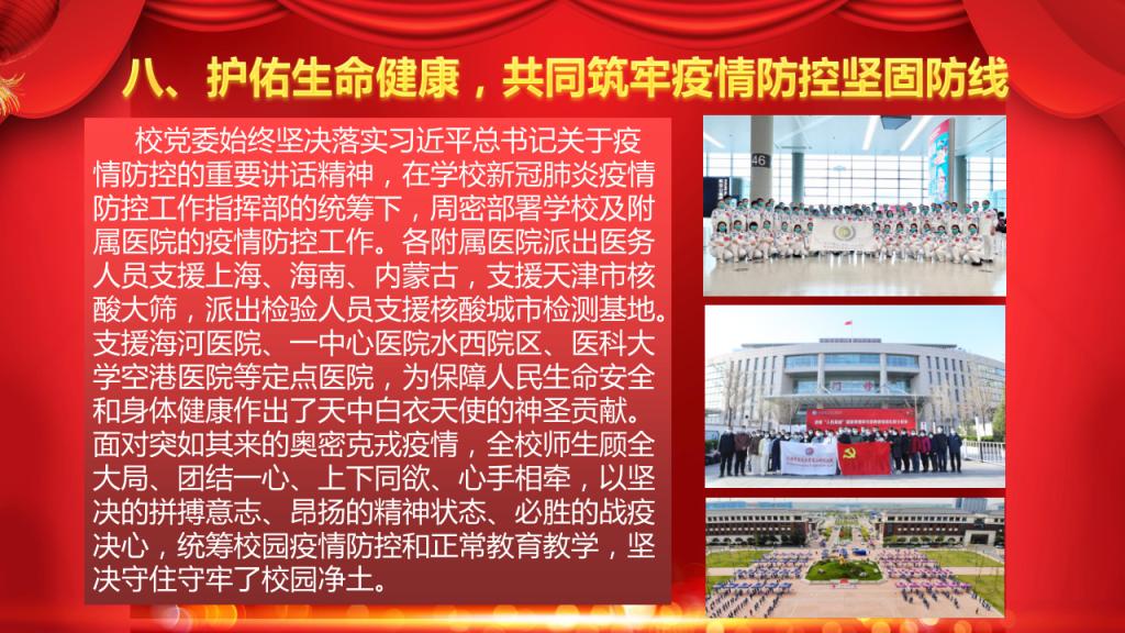 校党委始终坚决落实习近平总书记关于疫情防控的重要讲话精神,在学校新冠肺炎疫情防控工作指挥部的统筹下,周密部署学校及附属医院的疫情防控工作。各附属医院派出医务人员支援上海、海南、内蒙古,支援天津市核酸大筛,派出检验人员支援核酸城市检测基地。支援海河医院、一中心医院水西院区、医科大学空港医院等定点医院,为保障人民生命安全和身体健康作出了天中白衣天使的神圣贡献。面对突如其来的奥密克戎疫情,全校师生顾全大局、团结一心、上下同欲、心手相牵,以坚决的拼搏意志、昂扬的精神状态、必胜的战疫决心,统筹校园疫情防控和正常教育教学,坚决守住守牢了校园净土。