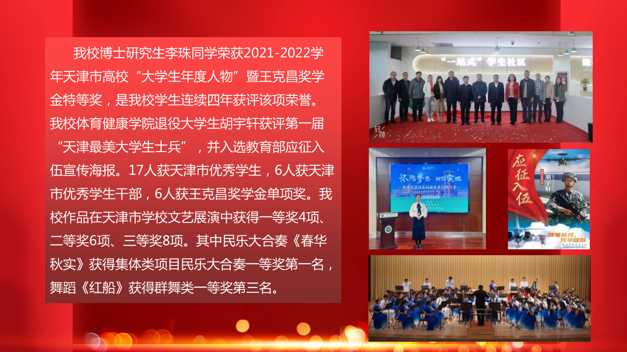 我校博士研究生李珠同学荣获2021-2022学年天津市高校“大学生年度人物”暨王克昌奖学金特等奖,是我校学生连续四年获评该项荣誉。我校体育健康学院退役大学生胡宇轩获评第一届“天津最美大学生士兵”,并入选教育部应征入伍宣传海报。17人获天津市优秀学生,6人获天津市优秀学生干部,6人获王克昌奖学金单项奖。我校作品在天津市学校文艺展演中获得一等奖4项、二等奖6项、三等奖8项。其中民乐大合奏《春华秋实》获得集体类项目民乐大合奏一等奖第一名,舞蹈《红船》获得群舞类一等奖第三名。