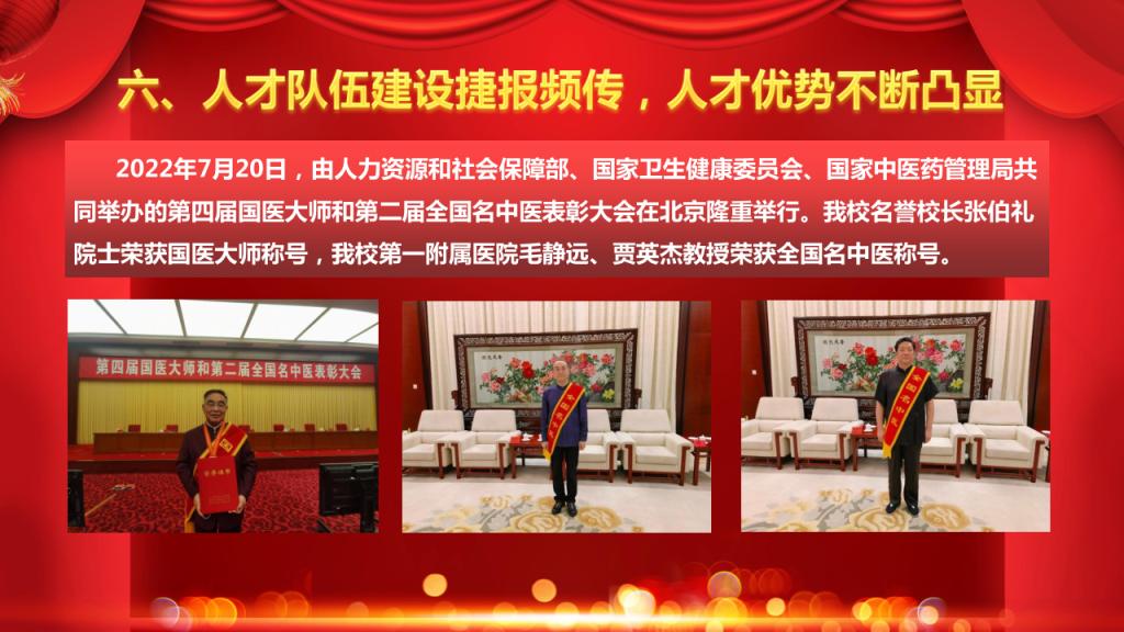 2022年7月20日,由人力资源和社会保障部、国家卫生健康委员会、国家中医药管理局共同举办的第四届国医大师和第二届全国名中医表彰大会在北京隆重举行。我校名誉校长张伯礼院士荣获国医大师称号,我校第一附属医院毛静远、贾英杰教授荣获全国名中医称号。