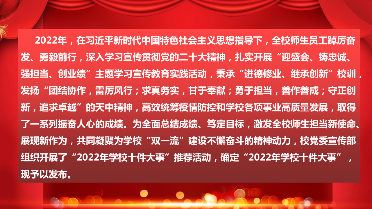 2022年,在习近平新时代中国特色社会主义思想指导下,全校师生员工踔厉奋发、勇毅前行,深入学习宣传贯彻党的二十大精神,扎实开展“迎盛会、铸忠诚、强担当、创业绩”主题学习宣传教育实践活动,秉承“进德修业、继承创新”校训,发扬“团结协作,雷厉风行;求真务实,甘于奉献;勇于担当,善作善成;守正创新,追求卓越”的天中精神,高效统筹疫情防控和学校各项事业高质量发展,取得了一系列振奋人心的成绩。为全面总结成绩、笃定目标,激发全校师生担当新使命、展现新作为,共同凝聚为学校“双一流”建设不懈奋斗的精神动力,校党委宣传部组织开展了“2022年学校十件大事”推荐活动,确定“2022年学校十件大事”,现予以发布。