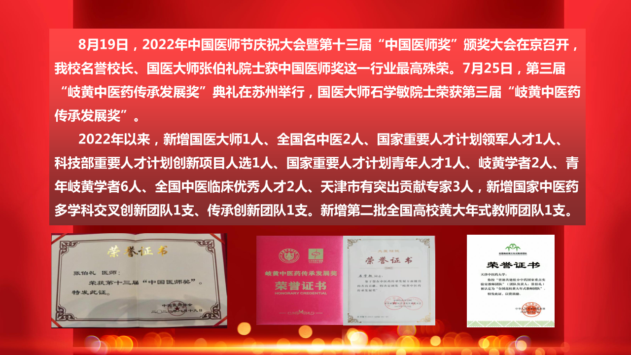 2022年以来,新增国医大师1人、全国名中医2人、国家重要人才计划领军人才1人、科技部重要人才计划创新项目人选1人、国家重要人才计划青年人才1人、岐黄学者2人、青年岐黄学者6人、全国中医临床优秀人才2人、天津市有突出贡献专家3人,新增国家中医药多学科交叉创新团队1支、传承创新团队1支。新增第二批全国高校黄大年式教师团队1支。