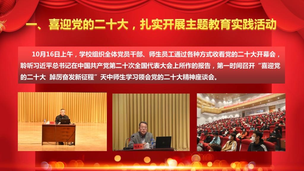 同时,学校党委扎实开展“迎盛会、铸忠诚、强担当、创业绩”主题学习宣传教育实践活动,推动落实“我为群众办实事”各项举措,广大师生员工坚定捍卫“两个确立”,坚决做到“两个维护”,精神面貌焕然一新。