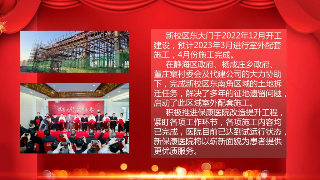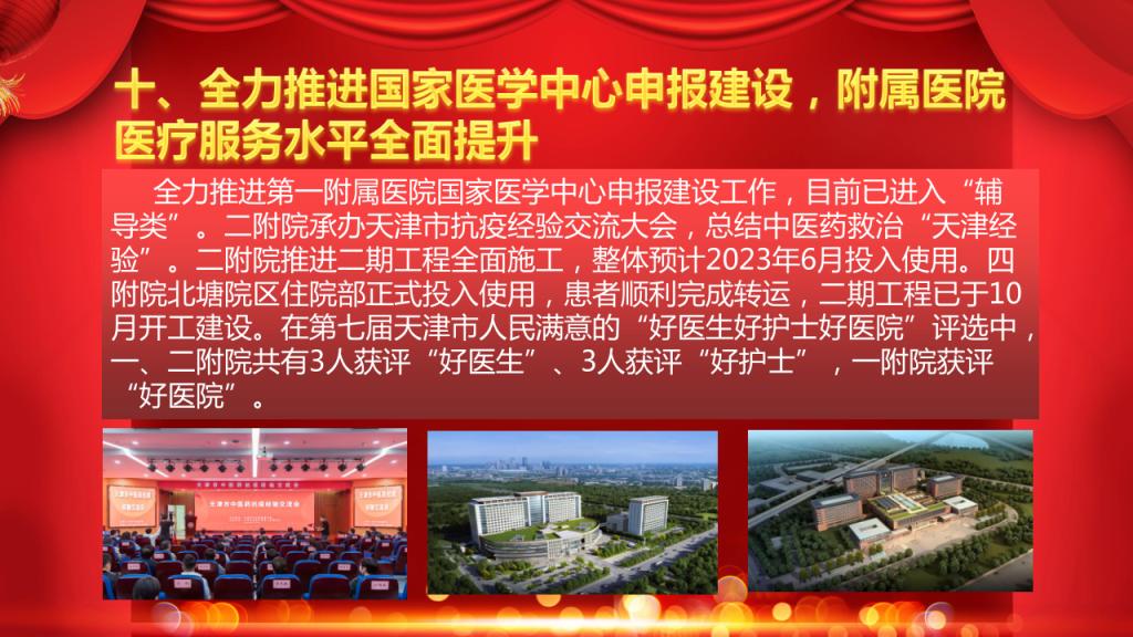 全力推进第一附属医院国家医学中心申报建设工作,目前已进入“辅导类”。二附院承办天津市抗疫经验交流大会,总结中医药救治“天津经验”。二附院推进二期工程全面施工,整体预计2023年6月投入使用。四附院北塘院区住院部正式投入使用,患者顺利完成转运,二期工程已于10月开工建设。在第七届天津市人民满意的“好医生好护士好医院”评选中,一、二附院共有3人获评“好医生”、3人获评“好护士”,一附院获评“好医院”。
