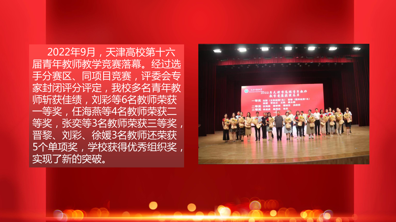 2022年9月,天津高校第十六届青年教师教学竞赛落幕。经过选手分赛区、同项目竞赛,评委会专家封闭评分评定,我校多名青年教师斩获佳绩,刘彩等6名教师荣获一等奖,任海燕等4名教师荣获二等奖,张奕等3名教师荣获三等奖,晋黎、刘彩、徐媛3名教师还荣获5个单项奖,学校获得优秀组织奖,实现了新的突破。