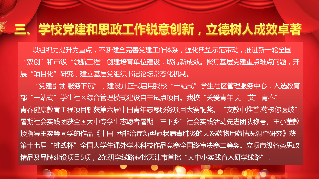“党建引领 服务下沉”,建设并正式启用我校“一站式”学生社区管理服务中心,入选教育部“一站式”学生社区综合管理模式建设自主试点项目。我校“关爱青年 无‘艾’青春”——青春健康教育工程项目斩获第六届中国青年志愿服务项目大赛铜奖。“支教中推普,药核你医岐”暑期社会实践团获全国大中专学生志愿者暑期“三下乡”社会实践活动先进团队称号。王小莹教授指导王奕等同学的作品《中国-西非治疗新型冠状病毒肺炎的天然药物用药情况调查研究》获第十七届“挑战杯”全国大学生课外学术科技作品竞赛全国终审决赛二等奖。立项市级各类思政精品及品牌建设项目5项,2条研学线路获批天津市首批“大中小实践育人研学线路”。