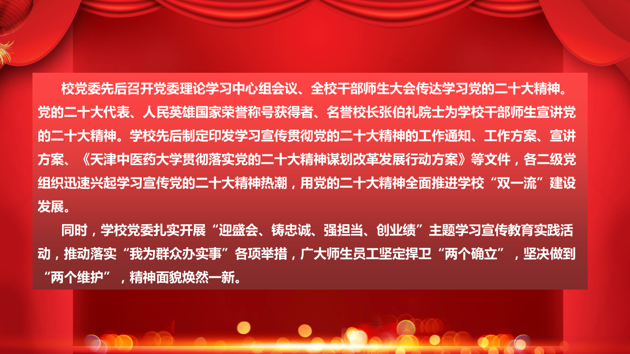 校党委先后召开党委理论学习中心组会议、全校干部师生大会传达学习党的二十大精神。党的二十大代表、人民英雄国家荣誉称号获得者、名誉校长张伯礼院士为学校干部师生宣讲党的二十大精神。学校先后制定印发学习宣传贯彻党的二十大精神的工作通知、工作方案、宣讲方案、《天津中医药大学贯彻落实党的二十大精神谋划改革发展行动方案》等文件,各二级党组织迅速兴起学习宣传党的二十大精神热潮,用党的二十大精神全面推进学校“双一流”建设发展。