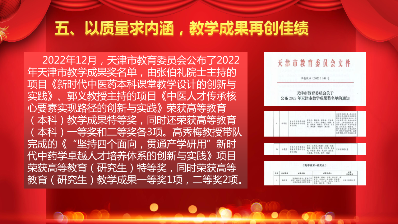 2022年12月,天津市教育委员会公布了2022年天津市教学成果奖名单,由张伯礼院士主持的项目《新时代中医药本科课堂教学设计的创新与实践》、郭义教授主持的项目《中医人才传承核心要素实现路径的创新与实践》荣获高等教育(本科)教学成果特等奖,同时还荣获高等教育(本科)一等奖和二等奖各3项。高秀梅教授带队完成的《“坚持四个面向,贯通产学研用”新时代中药学卓越人才培养体系的创新与实践》项目荣获高等教育(研究生)特等奖,同时荣获高等教育(研究生)教学成果一等奖1项,二等奖2项。