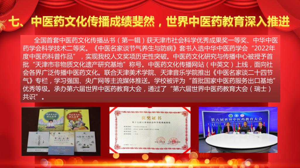 全国首套中医药文化传播丛书(第一辑)获天津市社会科学优秀成果奖一等奖、中华中医药学会科学技术二等奖。《中医名家谈节气养生与防病》套书入选中华中医药学会“2022年度中医药科普作品”,实现我校人文奖项历史性突破。中医药文化研究与传播中心被授予首批“天津市非物质文化遗产研究基地”称号。中医药文化传播网站(中英文)上线,面向社会各界广泛传播中医药文化。联合天津美术学院、天津音乐学院推出《中医名家谈二十四节气》专栏,学习强国、央广网等主流媒体推送。学校被评为“首批国家中医药服务出口基地”优秀等级。承办第六届世界中医药教育大会,通过了“第六届世界中医药教育大会(瑞士)共识”。