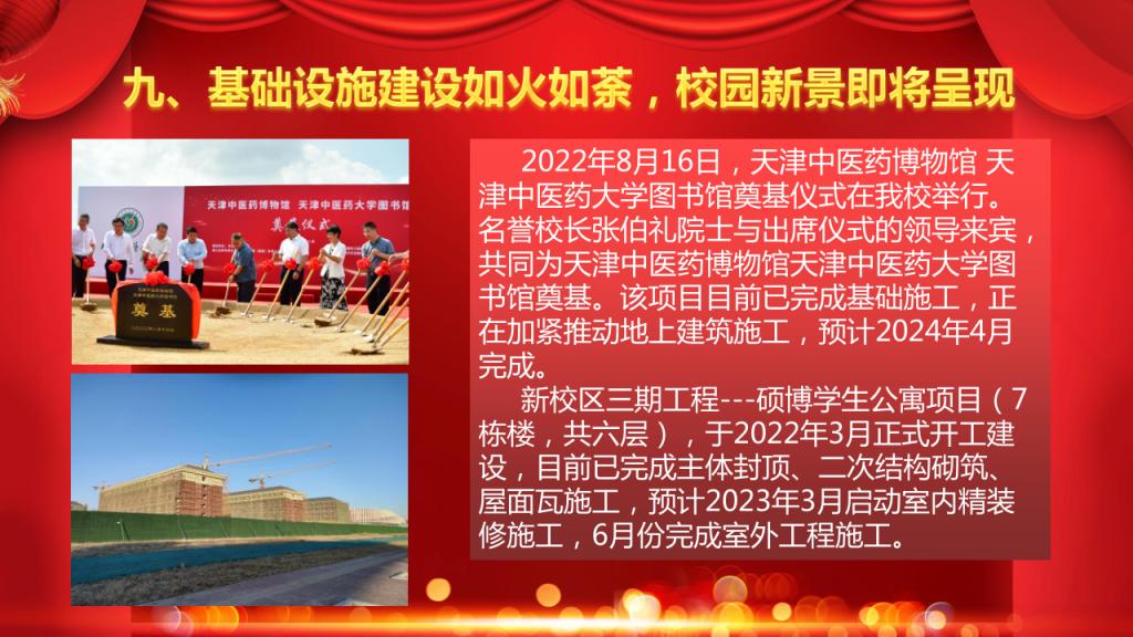 2022年8月16日,天津中医药博物馆 天津中医药大学图书馆奠基仪式在我校举行。名誉校长张伯礼院士与出席仪式的领导来宾,共同为天津中医药博物馆天津中医药大学图书馆奠基。该项目目前已完成基础施工,正在加紧推动地上建筑施工,预计2024年4月完成。