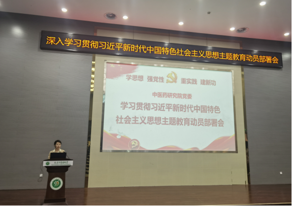 王怡书记向全体人员传达了学校有关主题教育实施方案,明确本次主题教育的总要求和重大意义;传达了校党委书记刘革生在学校召开学习贯彻习近平新时代中国特色社会主义思想主题教育动员部署会议上的讲话精神;同时,对中医药研究院开展主题教育作出了具体部署。王怡书记就如何开展好主题教育提出三点意见:一是提高政治站位,广大党员职工要充分认识开展本次主题教育的重大意义,把思想和行动统一到党中央和市委重大决策部署上来。二是加强理论学习,用习近平新时代中国特色社会主义思想武装头脑、凝心铸魂。三是大兴调研之风,走好群众路线。四是通过开展主题教育务求取得实效,推动事业高质量发展。